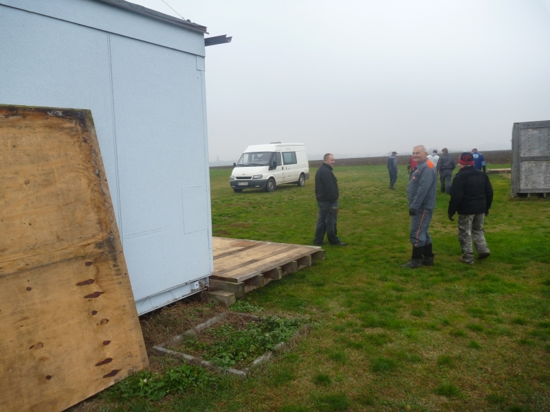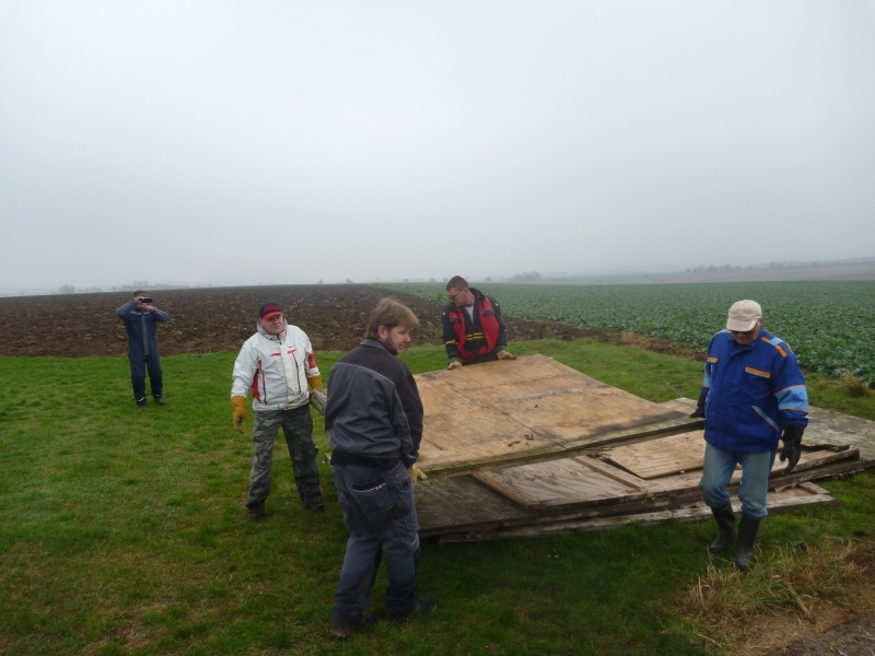 Desku a i ty ostatní jsme nakonec z pole dostali, to byla první část našeho dnešního úkolu. Druhá část úkolu byla pokusit se pohnout dnem rozbourané bedny, to už nám Milan sliboval nějaký ten pátek(možná rok a víc, že :-):-):-) ? ). No nakonec se toho muselo zhostit osm párů silných rukou a dno se pomalu vydalo na nové místo určení, vedle stávajících buněk, což se skutečně podařilo. Ještě nás čeká zajistit mechanizaci, která nám pomůže pohnout s druhou bednou. Ta přežila řádění povětrnostních vlivů bez úhony, klidně si stojí na místě a překáží parkování našich vozidel. Výsledkem našeho snažení bude tedy i přemístění druhé bedny k buňkám a když k tomu přidáme ještě něco vlastní práce, tak bychom měli vylepšit zázemí pro letní aktivity jednak s mládeží, ale i pro jiné akce