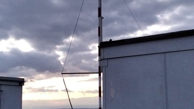 Přidali jsme třetí lanko s výložníkem. Teď už si může vítr funět (samozřejmě v noci) a stožát se mrskat nebude. Srážkové čidlo nebude dávat falešné impulzy.