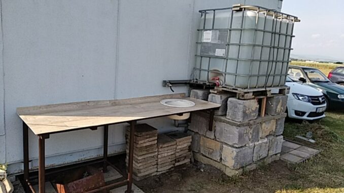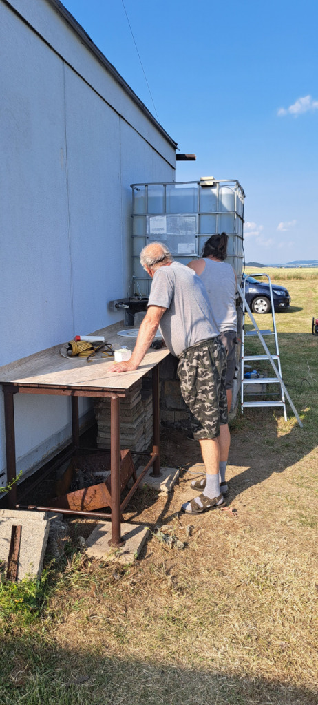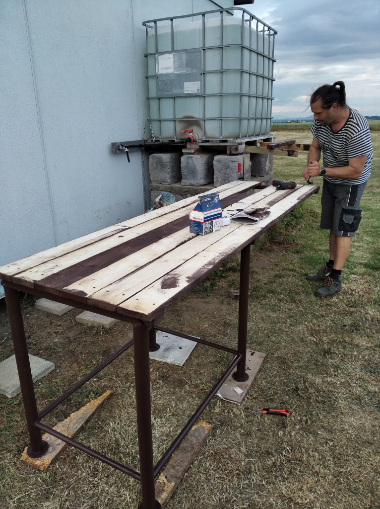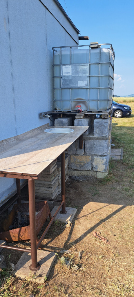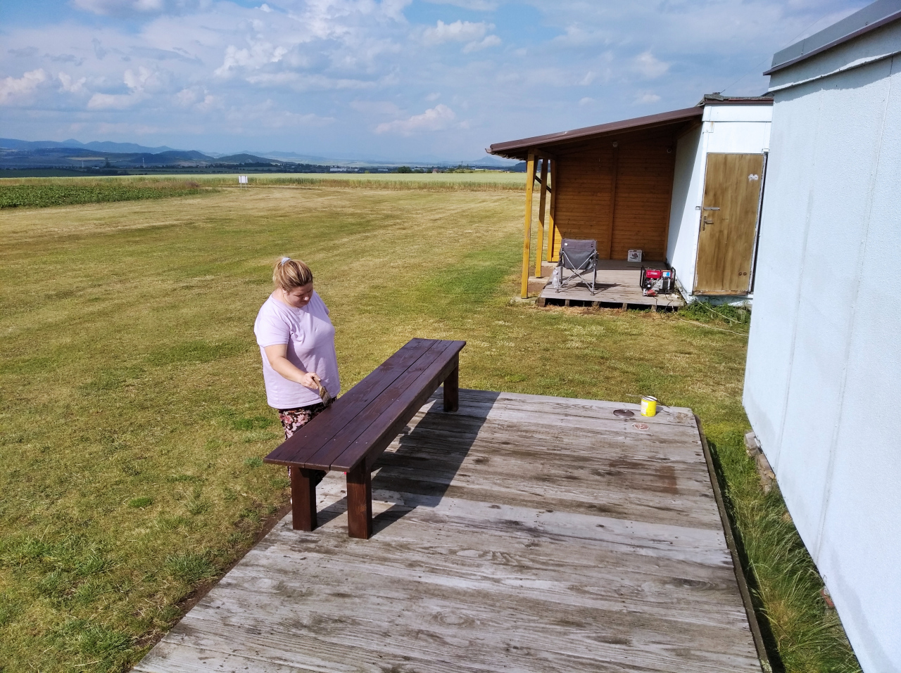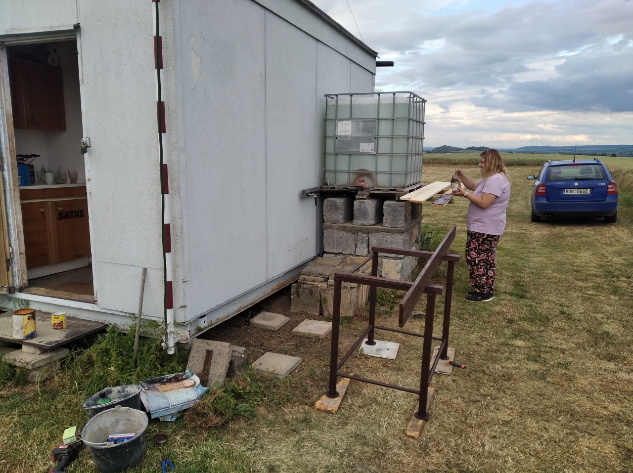 Zase jsme trochu vylepšili podmínky na letišti před plánovaným víkendem s mládeží. Pro Míru jsme postavili kuchyňskou linku se dřezem, aby měl více pohodlí při vaření. Pro ochlazení v horkých letních dnech jsme nainstalovali sprchu. Drobných úprav se dočkal i nový nábytek od Jirky.