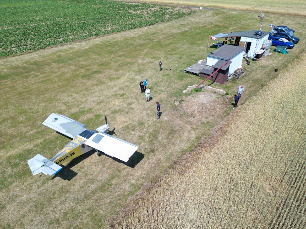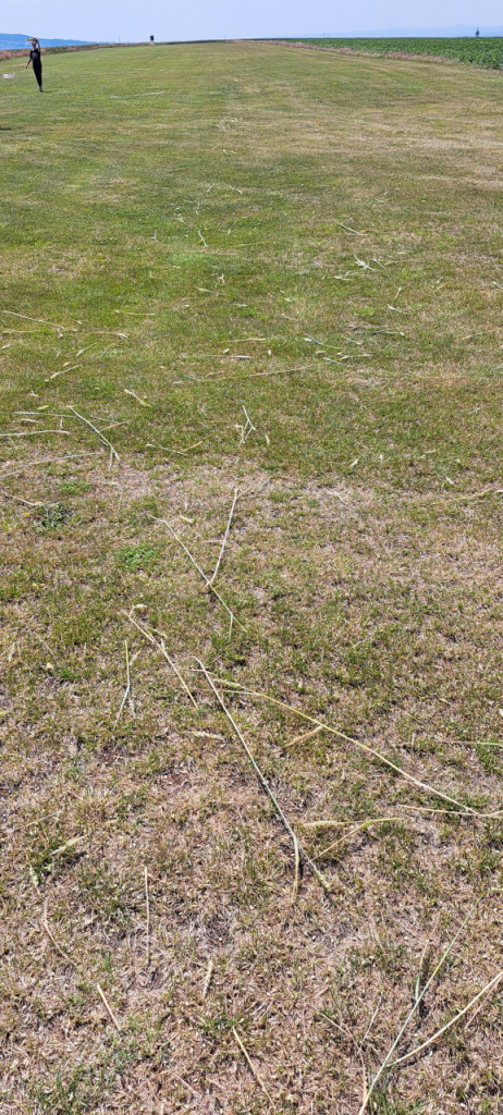 Na první pohled sebevražedné přistání nám předvedl odvážný pilot ultralajtu. Přiblížení provedl sotva v pěti metrech téměř krokem a v poslední zatáčce musel přidat, aby nezůstal daleko v obilí. Na přistání mu z naší téměř půlkilometrové dráhy stačilo třicet metrů. Vše dobře dopadlo a k úhoně přišlo jen deset metrů obilí na hraně dráhy. Je to prý „traktor s pádovkou 40“ takže chlapec asi zkoušel co to dá.