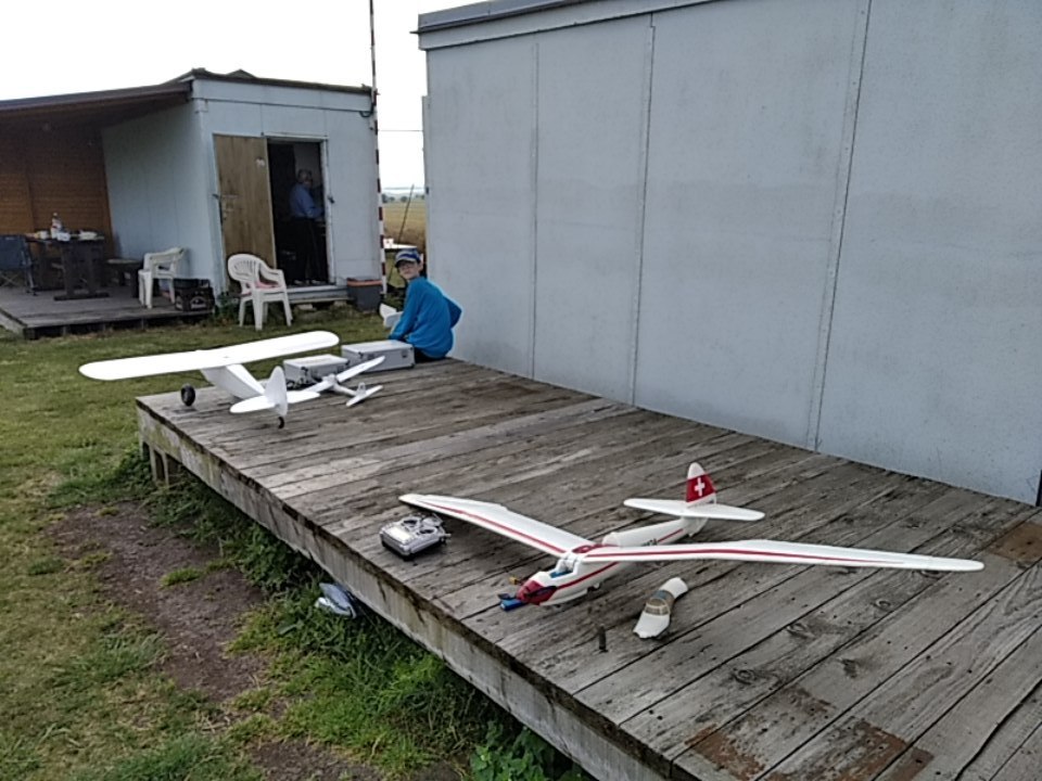 V neděli ráno se zastavil Pavel Kukla provětrat svůj velký motorový šusťák. Některé unavenější členy výpravy jeho start za rozbřesku ani neprobudil. Neděle byla slunečná a dopoledne i téměř bez větru. Pavlové vytáhli gumicuk a zalétali jejich nové RCH házedlo, s cennými radami jim asistoval ostřílený harcovník Luboš. Já s Tomem vytáhl potuněné RC A3, ale moc toho ve vzduchu pro naše kovadliny s malou plochou křídla nebylo. Petrovo zběsilý stroj také nakonec vzlétl a svižným tempem krájel vzduch.